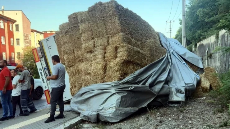 Bartın'da kavşağa hızlı giren saman yüklü tır devrildi.