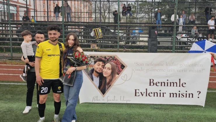 Kastamonu 1'inci Amatör Lig'de şampiyon olan Cide Belediyesporlu Samed Duman, tribünde maçı izleyen kız arkadaşını sahaya davet ederek, evlilik teklifinde bulundu.