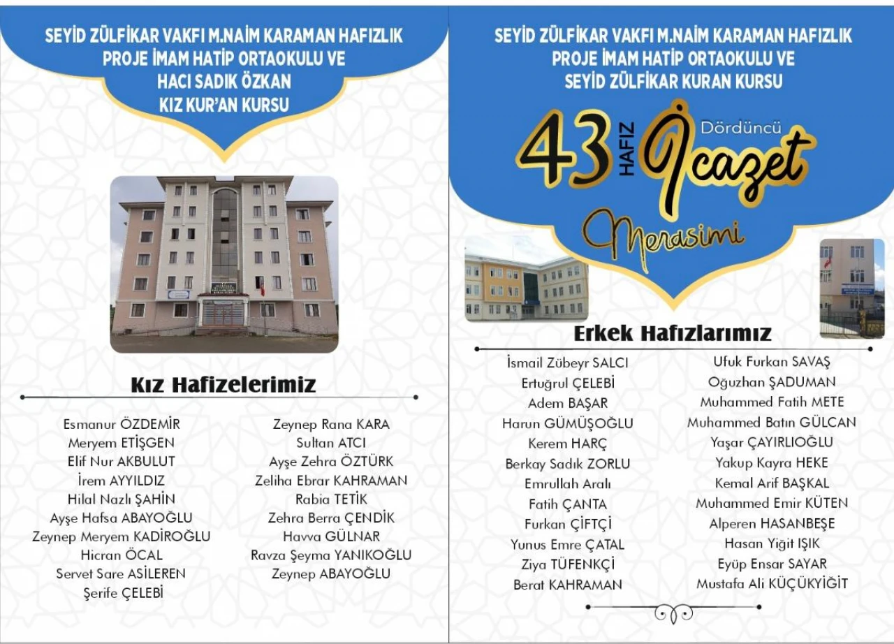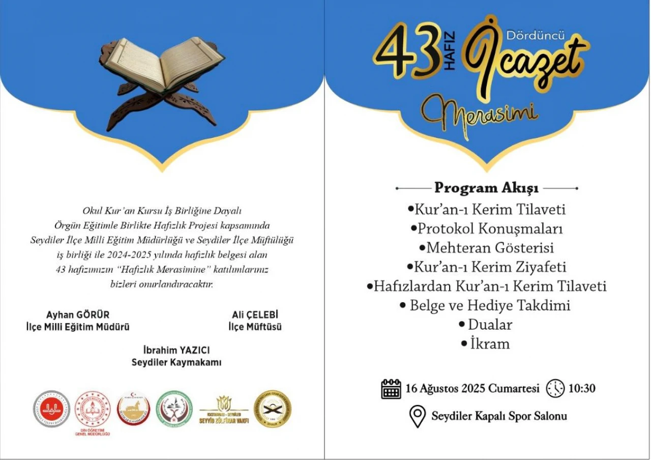 24 erkek hafız ve 19 kız hafize, yoğun bir emek ve sabırla Kur’an-ı Kerim’i baştan sona ezberleyerek hafızlıklarını tamamladı. Bu büyük başarı, 16 Ağustos 2025 Cumartesi günü saat 10.30’da, Seydiler Kapalı Spor Salonu’nda düzenlenecek bir törenle taçlandırılacak.