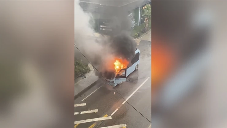 Minibüsteki yangın, çevredeki vatandaşlar tarafından cep telefonu kamerasıyla kaydedildi.