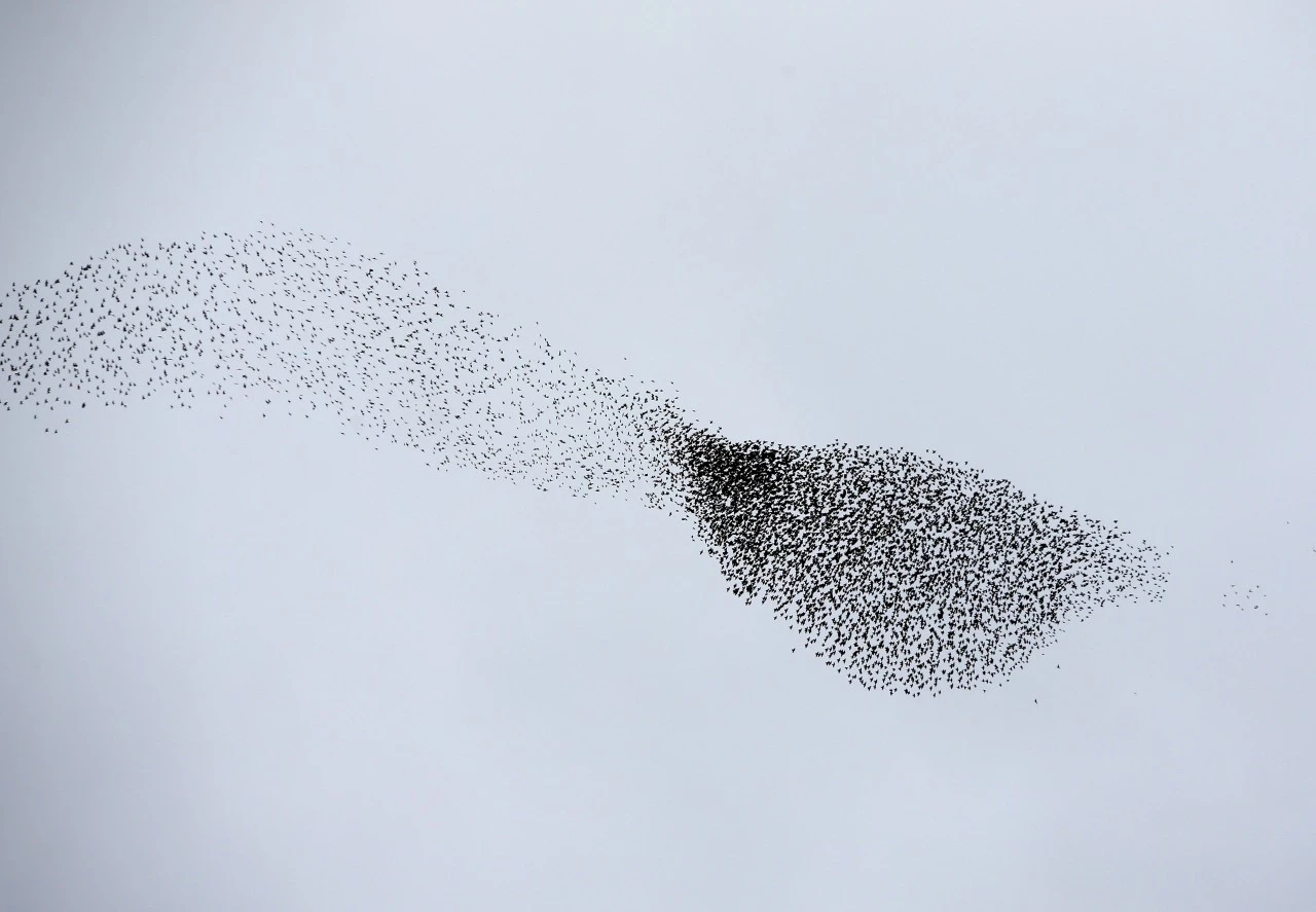 Oyrak mevkisinde, kümelenerek farklı şekiller oluşturan sığırcıkların görüntüsü kamerayla kaydedildi. Hava kararana kadar süren sığırcıkların dansına şahit olanlar bu anı ilgiyle takip etti.