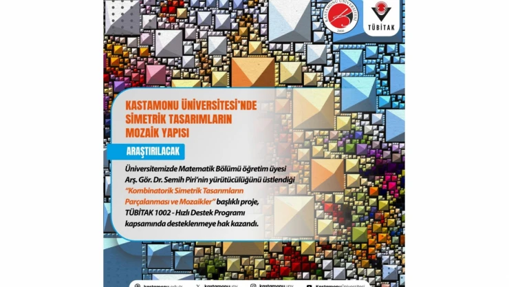 Kastamonu Üniversitesi Fen Fakültesi Matematik Bölümü öğretim üyesi Arş. Gör. Dr. Semih Piri’nin yürütücülüğünü üstlendiği “Kombinatorik Simetrik Tasarımların Parçalanması ve Mozaikler” başlıklı proje, TÜBİTAK 1002 - Hızlı Destek Programı kapsamında desteklenmeye değer bulundu.