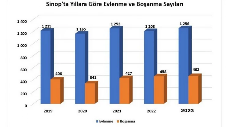 Sinop’ta ise evlenen çiftlerin sayısı bir önceki yıla göre yüzde 4,0 artarak 2023 yılında bin 256 oldu. Kaba evlenme hızı binde 5,58 oldu. Sinop bu oranla kaba evlenme hızı sıralamasında 81 il içerisinde 68. sırada yer aldı. Boşanan çiftlerin sayısı bir önceki yıla göre yüzde 0,9 artarak 462 oldu. Kaba boşanma hızı binde 2,05 oldu.