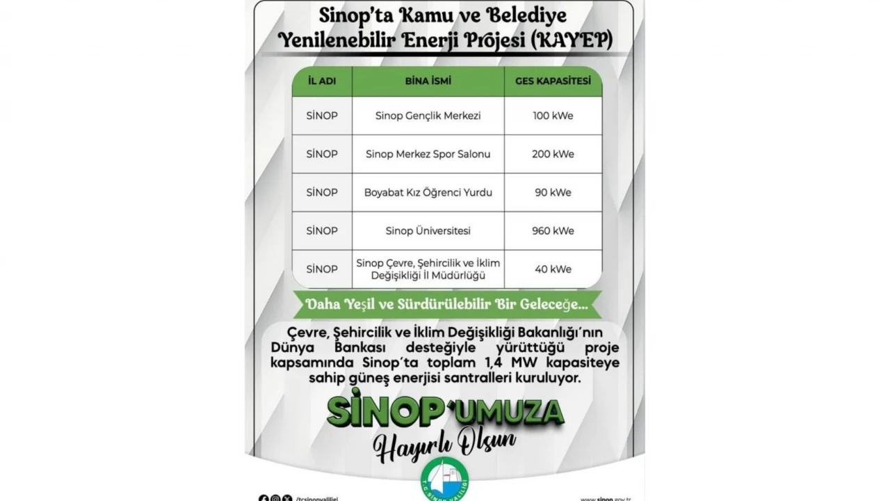Sinop'ta Çevre, Şehircilik ve İklim Değişikliği Bakanlığı tarafından yürütülen KAYEP Projesi kapsamında, kentteki kamu binalarına güneş enerjisi santralleri kurulacağı açıklandı.