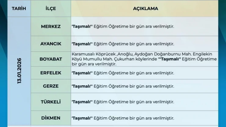 Valilikten yapılan açıklamada, 13 Ocak 2026 Salı günü Merkez ilçe ile Ayancık, Erfelek, Dikmen, Gerze ve Türkeli ilçelerinde taşımalı eğitime bir gün süreyle ara verildiği bildirildi. Boyabat ilçesinin ise bazı bölgelerinde taşımalı eğitime kısmi olarak ara verildiği kaydedildi.