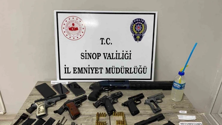 Sinop İl Emniyet Müdürlüğü Narkotik Suçlarla Mücadele Şube Müdürlüğü ekipleri tarafından şehir merkezinde gerçekleştirilen operasyonlarda; 3 adet ruhsatsız tabanca, 42 adet fişek, 25 adet muhtelif tabanca parçası, 1 adet tüfek, 0,53 gram metamfetamin maddesi ele geçirildi. Olayla ilgili 3 şüpheli şahıs yakalandı. Yakalanan şüphelilerden 1’i tutuklanarak cezaevine gönderildi.