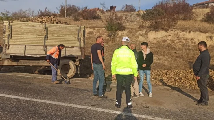 Şeker Fabrikası'nda hasadını yaptıkları pancarları fabrikaya teslim etmek için oluşan uzun kuyrukta, sıraya girmek isteyen pancar yüklü traktör, rampada kalması sonucu devrildi.