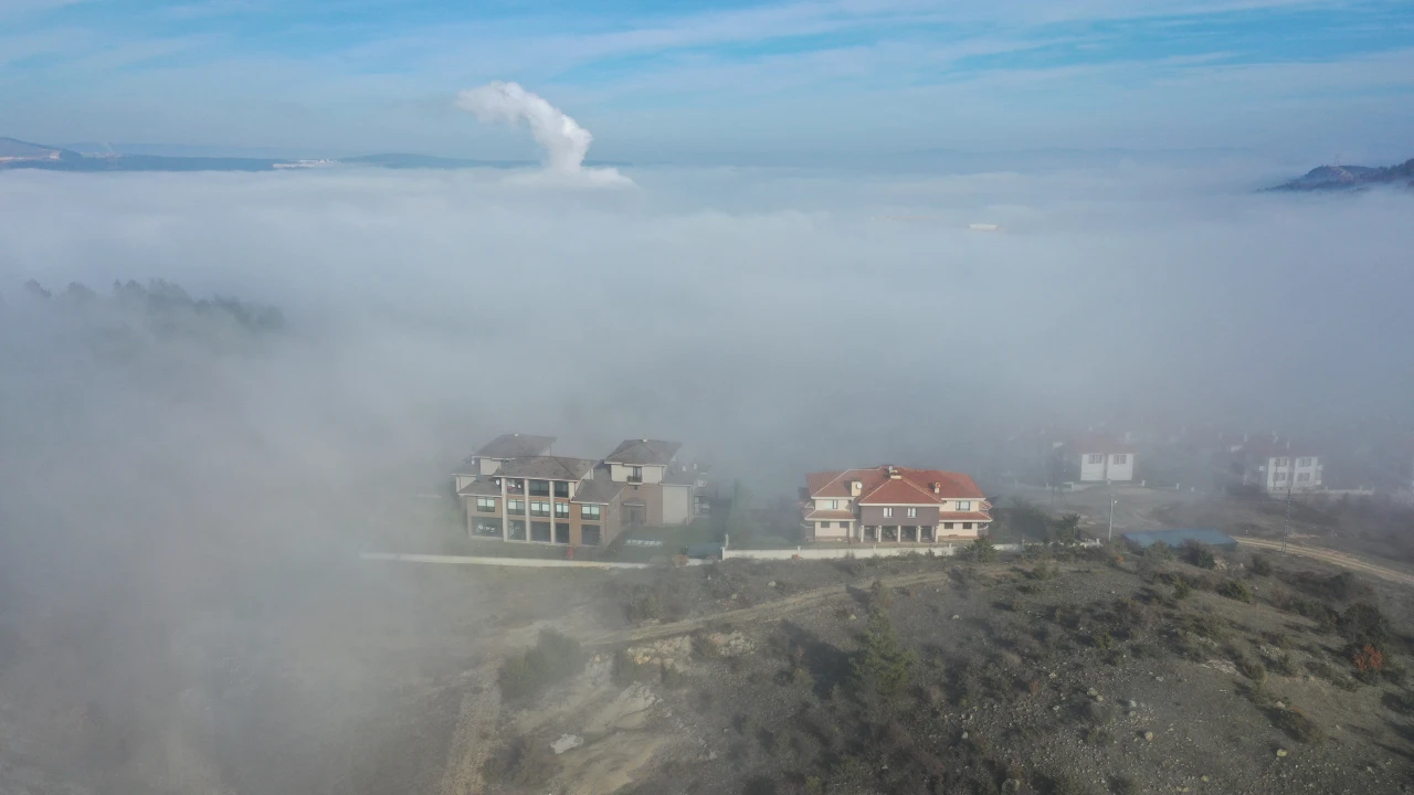 Gün boyu şehrin üzerine yayılan sis nedeniyle binalar sis altında kaldı. Sis bulutuyla bütünleşen manzara, dronla görüntülendi.