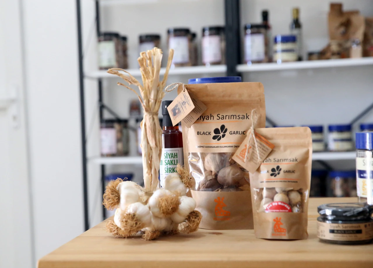 Zamanla ürün çeşitliliğini artırdıklarını dile getiren Cebeci, "İlk başta sadece baş olarak ürettiğimiz siyah sarımsağı, şimdilerde çeşitlendirdik. Bunun püresini yaptık, burada yetişen yine tek diş 'mürdük' diye özel bir sarımsak var. Onu siyahlaştırdık, onun siyah mürdüğünü üretmeyi başardık. Siyah sarımsaktan sirke gibi çok farklı ürünler yaptık. Ondan fazla değişik siyah sarımsak ürünümüz var. Bu ürünleri tesisimizde fermente ettikten sonra ambalajlıyoruz ve zincir marketlere veriyoruz, restoranlara veriyoruz" diye konuştu.