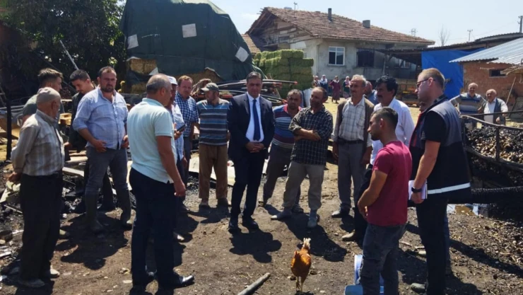 Yangında 11 adet buzağı telef olan ahır ile birlikte yaklaşık 500 adet saman ve yonca balyası, 10 ton sarımsak ve traktör römorku yanan çiftçilerden Mustafa Sarı'yı, Tarım ve Orman İl Müdürü Bekir Yücel Tanrıkulu ziyaret etti.