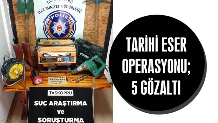 Taşköprü İlçe Emniyet Müdürlüğü ekiplerince şüphe üzerine yürütülen çalışmalarda tespiti yapılan bir ikamet, ikamete ait müştemilat ve bir araçta arama yapıldı. Yapılan aramalarda; 21 parça çeşitli boyutlarda tarihi eser olduğu değerlendirilen madeni para, 3 parça çeşitli boyutlarda tarihi eser olduğu değerlendirilen sikke, 1 adet kırıcı-delici matkap, 1 adet jeneratör, 1 adet sarma aparatlı elektrik kablosu, kazma, kürek, el feneri, çizme ve çeşitli ebatlarda kırıcı-delici matkap ucu ele geçirildi. Olayla ilgili 5 kişi gözaltına alındı. E.P.