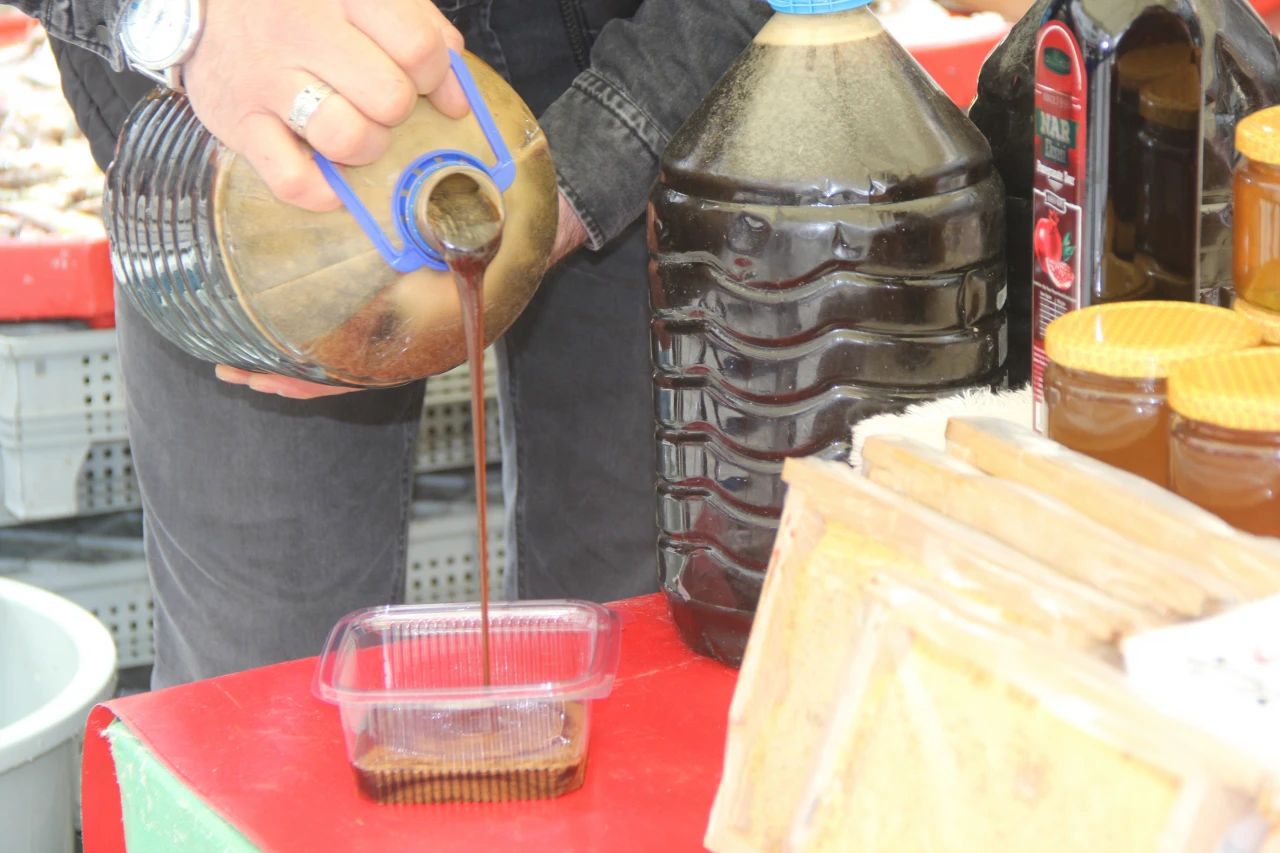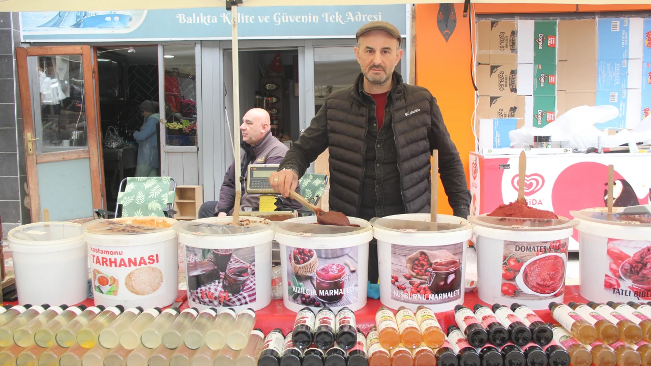 Yöresel Doğal Ürünler Firma Sahibi Yavuz Vefaoğlu, semt pazarında köyden getirdiği Pancar Pekmezi ve marmelatların farklılıkları ve saklanma koşulları hakkında açıklamada bulundu.