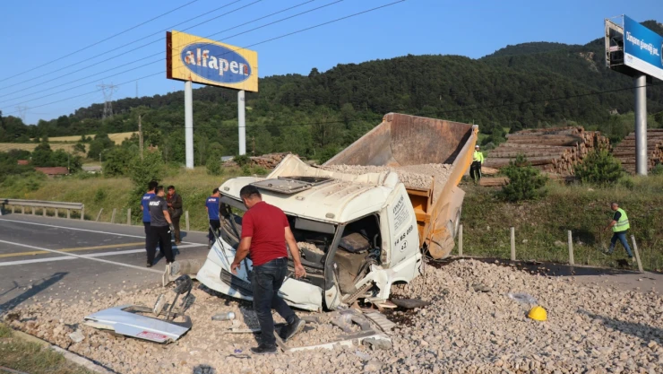 Taş yüklü kamyon D-100 karayoluna uçtu