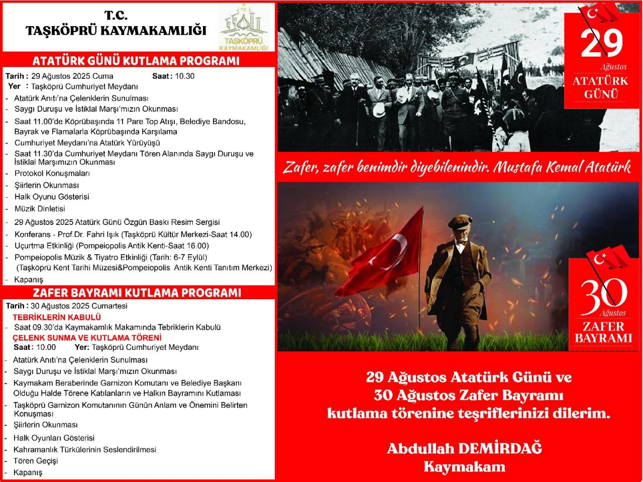 Taşköprü Kaymakamı Abdullah Demirdağ, tüm vatandaşları 29 Ağustos Atatürk Günü ve 30 Ağustos Zafer Bayramı etkinliklerine davet etti.