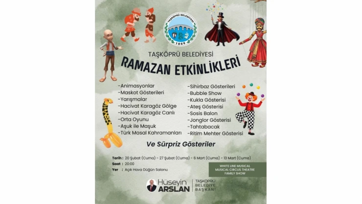 Taşköprü Belediye Başkanı Hüseyin Arslan; “Mübarek Ramazan ayının manevi atmosferini ilçemizde hep birlikte yaşamaya devam ediyoruz. Geleneksel Ramazan etkinliklerimizi bu yıl da çocuklarımızın neşesi ve ailelerimizin birlikteliğiyle sürdürüyoruz. Her hafta Cuma akşamı saat 20.00’da Taşköprü Belediyesi Açık Hava Düğün Salonu’nda düzenleyeceğimiz programlarımıza tüm hemşerilerimizi davet ediyorum. Ramazan-ı Şerif’imiz mübarek olsun” dedi.