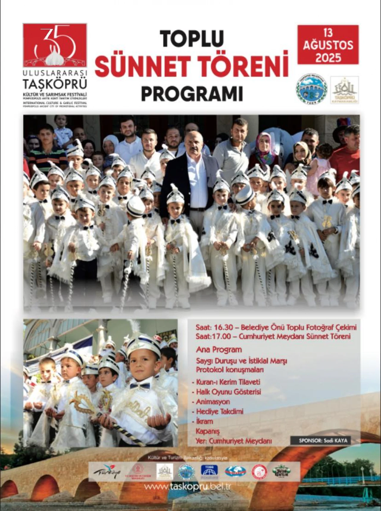 Taşköprü Belediyesi, bu yıl 35'incisi düzenlenecek Uluslararası Kültür ve Sarımsak Festivali etkinlikleri kapsamında Toplu Sünnet Töreni organize edecek.