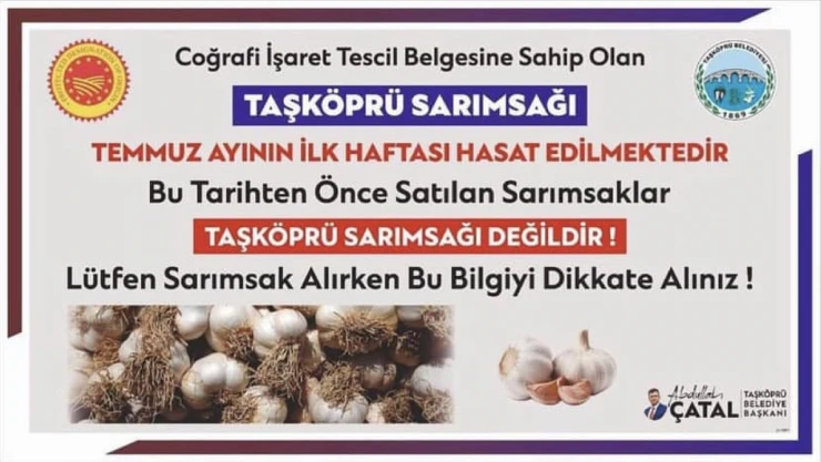 Taşköprü Belediye Başkanlığı’ndan yapılan uyarıda; “AB Coğrafi İşaret Belgeli Taşköprü Sarımsağımızın hasadına Temmuz ayının ilk haftası başlanmaktadır. Bu tarihten önce satılan sarımsaklar ‘Taşköprü Sarımsağı’ değildir... 4 bin üreticimizin alın terini korumak ve Beyaz Altın Taşköprü Sarımsağımızın hak ettiği değeri korunması için bu bilgiyi lütfen göz ardı etmeyelim” denildi.