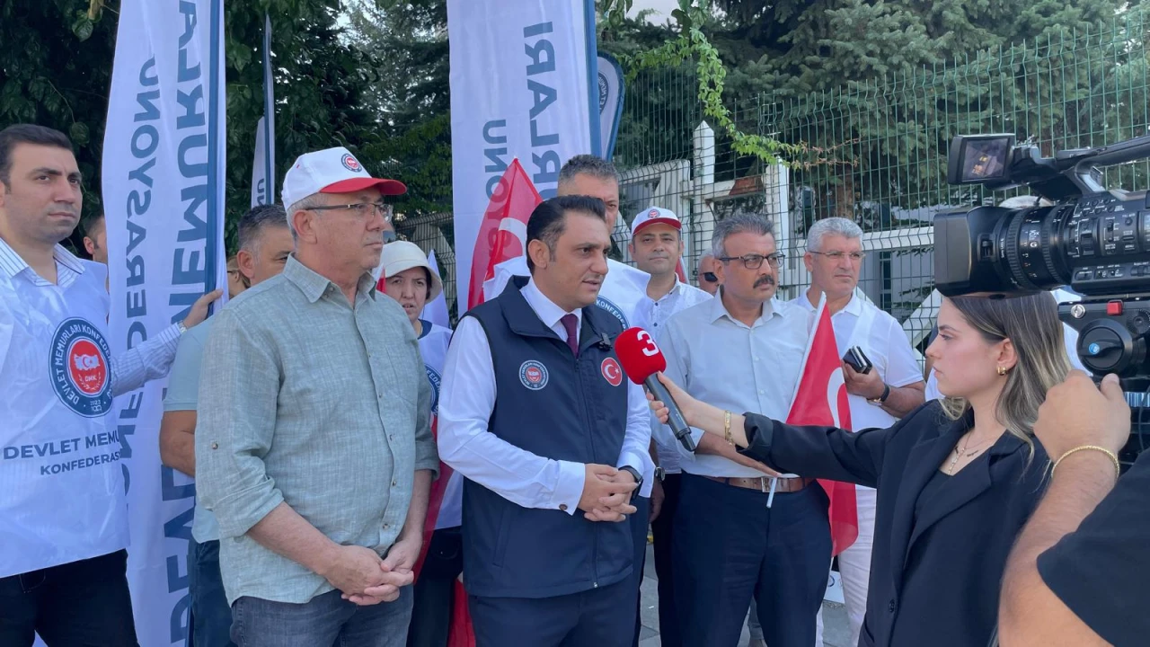 Çalışma ve Sosyal Güvenlik Bakanlığı önünde Devlet Memurları Konfederasyonu ve paydaş sendikaları adına ortak basın açıklamasını TEÇ-SEN Genel Başkanı Ümit Demirel gerçekleştirdi.
