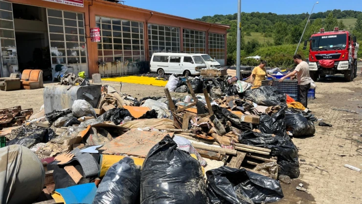 Bartın’da yaşanan sel afetinde çevresindeki dere yataklarının taşması sonucu çok sayıda iş yerinin sular altında kaldığı Atılım Sanayi Sitesi'nde sürdürülen temizlik çalışmalarına iş makineleri ve arazözlerle destek veriliyor. Selle birlikte kullanılmaz hale gelen tonlarca malzeme ve ürün ise kamyonlarla şehir çöplüğüne taşınıyor.