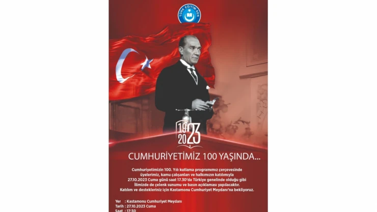 Türk Eğitim-Sen Şubesi tarafından yapılan bilgilendirmede; “Sendikamızın, Cumhuriyetimizin 100’üncü Yılı Kutlama Programımız çerçevesinde üyelerimiz, kamu çalışanları ve vatandaşlarımızın katılımıyla 27 Ekim 2023 Cuma günü 17.30’da Türkiye genelinde olduğu gibi ilimizde de bir dizi etkinlik planlanmıştır. Bu etkinlikler kapsamında Cumhuriyet Meydanı Atatürk Anıtına Cumhuriyetimizin banisi Atamıza şükran ve minnet duygularımızın ifadesi anlamında, çelenk sunumu yapılacak akabinde ‘Bayramımız Kutlu Olsun Cumhuriyetimiz 100 Yaşında’ konulu kutlama mesajımız açıklanarak çevrede bulunan vatandaşlarımıza ve özellikle çocuklarımıza şanlı bayrağımız ve ‘Cumhuriyetimiz 100 Yaşında…’ temalı afişimiz dağıtılacaktır. Katılım ve destek için sizleri Cumhuriyet Meydanı Atatürk Anıtı’na bekliyoruz” denildi.