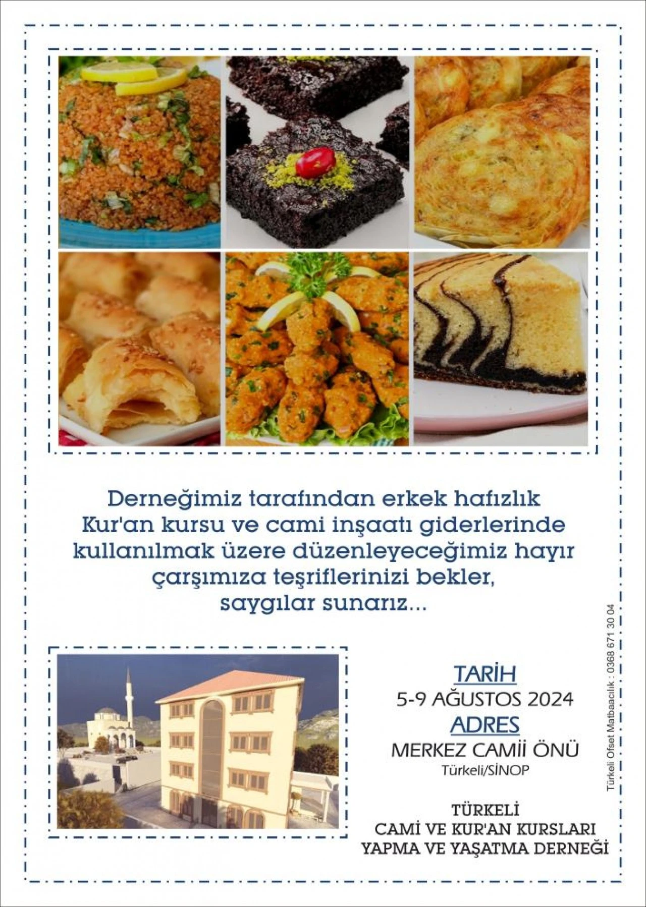 Türkeli Cami ve Kur’an Kursları Yapma ve Yaşatma Derneği tarafından ilçenin hastane üstü top meydanı mevkiinde yapımı devam eden Erkek Hafızlık Yatılı Kur’an Kursu ve Camii inşaatı giderlerinde kullanılmak üzere “Hayır Çarşısı” organize edilecek.