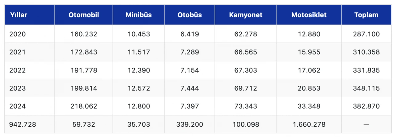 Türkiye'de 2020-2024 döneminde motorlu taşıtların bazılarının katettikleri yollar şöyle (milyon kilometre):