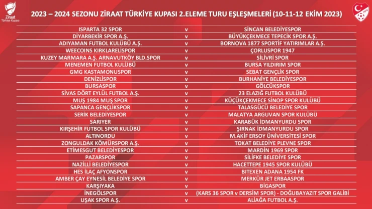 Orhan Saka Konferans Salonu'nda Türkiye Futbol Federasyonu 2. ve 3. Lig Kulüplerinden Sorumlu Yönetim Kurulu Üyesi Volkan Can tarafından gerçekleştirilen kura çekimine, TFF Lig Yönetimi Direktörü Özcan Şepik ve Maç Planlama Müdürü Besim Yalçın eşlik etti. Besim Yalçın kura çekimi öncesi eleme turuna ilişkin teknik bilgilendirme yaptı. Kura çekim töreninde kulüp başkanları ve temsilcileri de yer aldı. Ziraat Türkiye Kupası 2. Eleme turu müsabakalarına, 1. Ön Eleme Turu maçlarında tur atlayan 31 takım ve TFF 2. Lig’den 19 olmak üzere toplam 50 takım katıldı. Müsabakalar tek maç eleme usulüne göre 10, 11 ve 12 Ekim tarihlerinde oynanacak. Ziraat Türkiye Kupası statüsü gereği müsabakalar seri başı takımların ev sahipliğinde yapılacak.