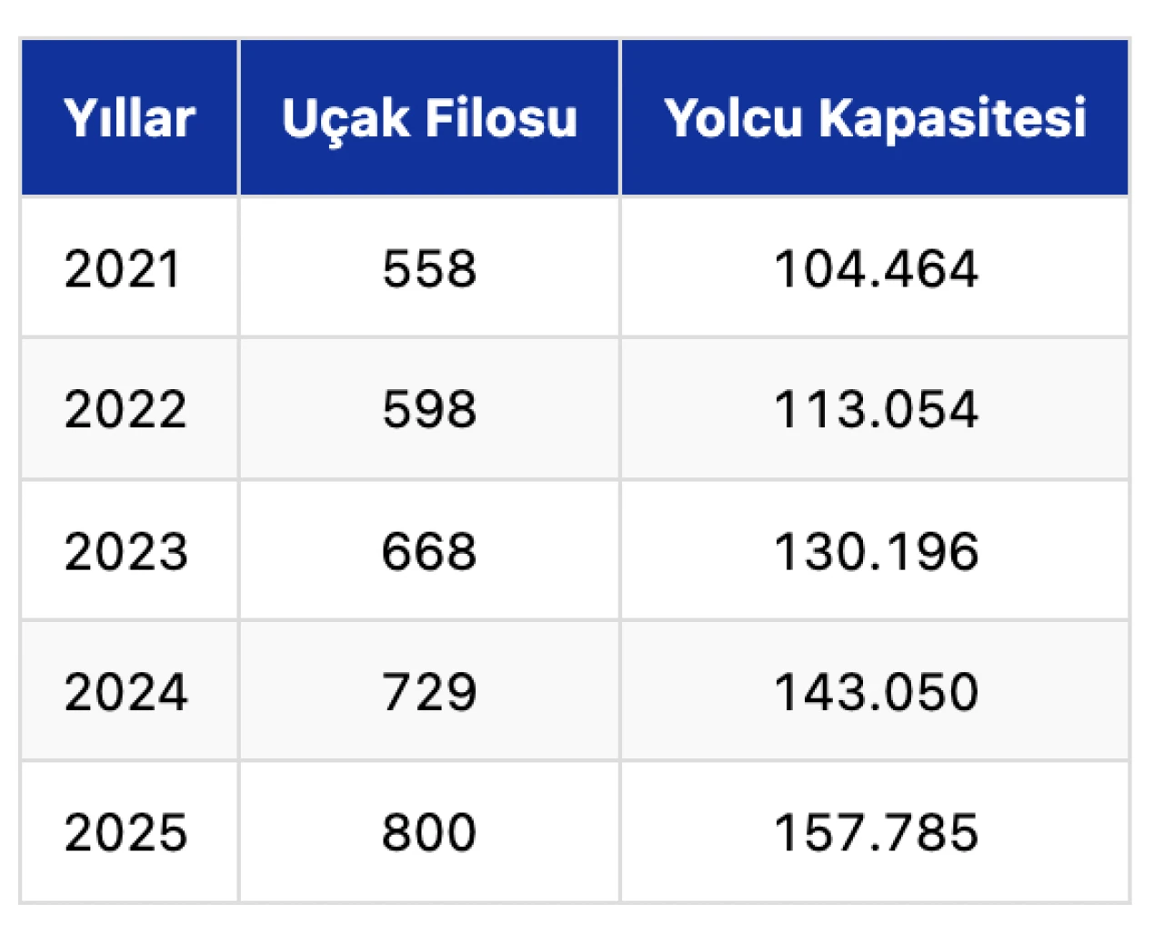 Türkiye'deki hava yolu firmalarının son 5 yılda sahip olduğu toplam uçak sayısı ve yolcu kapasitelerine ilişkin veriler şöyle: