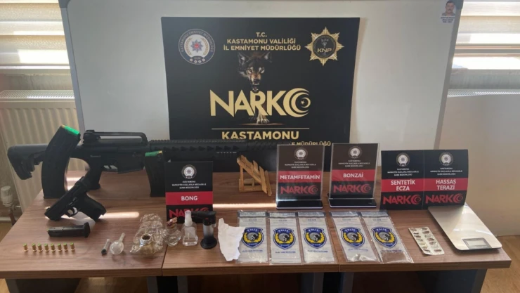 Edinilen bilgiye göre, Taşköprü’de uyuşturucu madde kullanan ve satan şahıslara yönelik olarak operasyonda 5’i ikamet 1’i iş yeri olan 6 adreste arama yapıldı. Arama sonucu 25.30 gram uyuşturucu madde yapımında kullanıldığı düşünülen sıvı madde, 1.17 gram metamfetamin, 1.85 gram bonzai, 2 adet uyuşturucu hap, 2 adet uyuşturucu içiminde kullanılan cam düzenek, 1 adet hassas terazi, 1 adet ruhsatsız pompalı av tüfeği, 14 adet kartuş, 1 adet kurusıkı tabanca ve bu tabancaya ait 18 adet fişek ele geçirildi. Yakalanan 2 şahıs ile ilgili adli işlemlere başlandı.