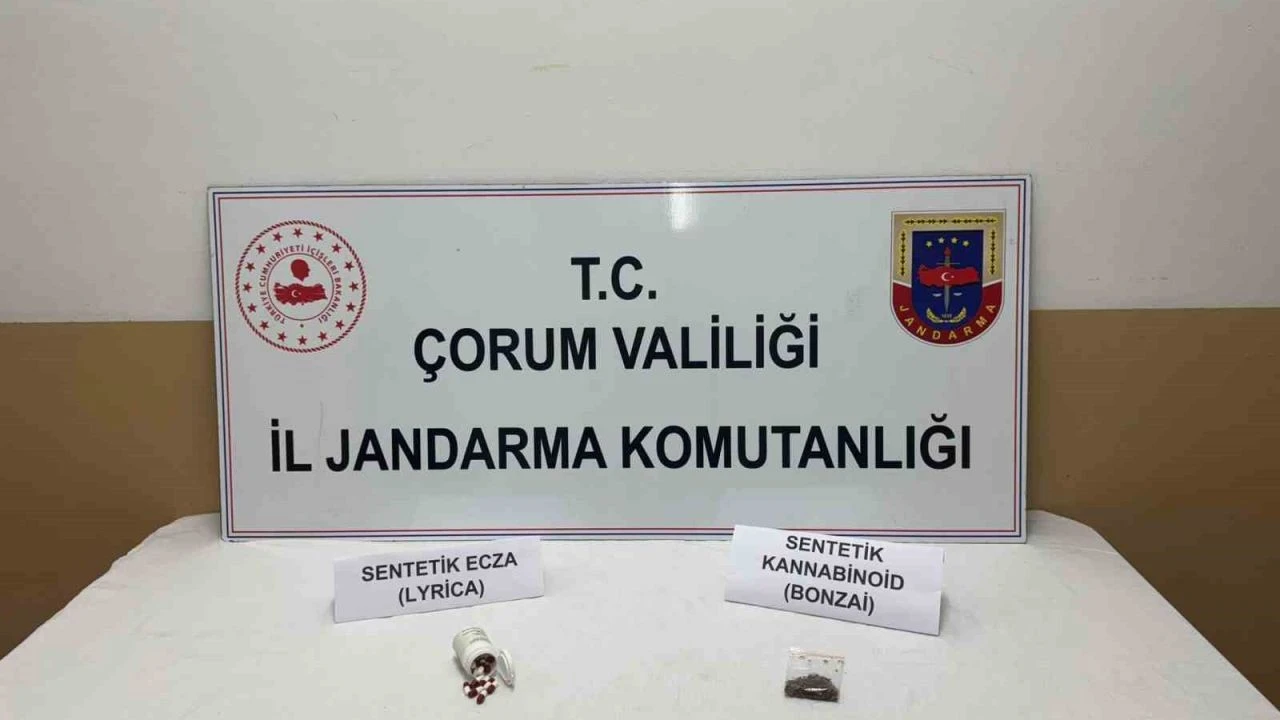 Çorum'un Alaca ilçesinde jandarma ekiplerinin yaptığı yol kontrol uygulamasında durdurulan bir araçta sentetik uyuşturucu ve ecza hapları ele geçirildi. Olayla ilgili 2 şüpheli gözaltına alındı.