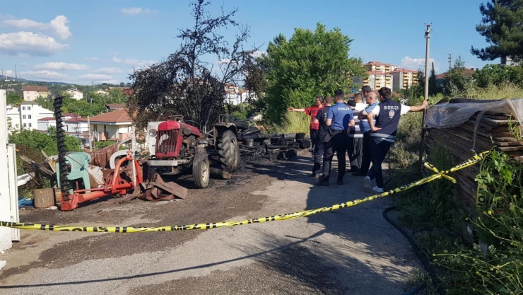 Traktör büyük hasar aldığı yangında meyve ağacı da zarar gördü. Polis yangının çıkış nedeniyle ilgili inceleme başlatıldı.