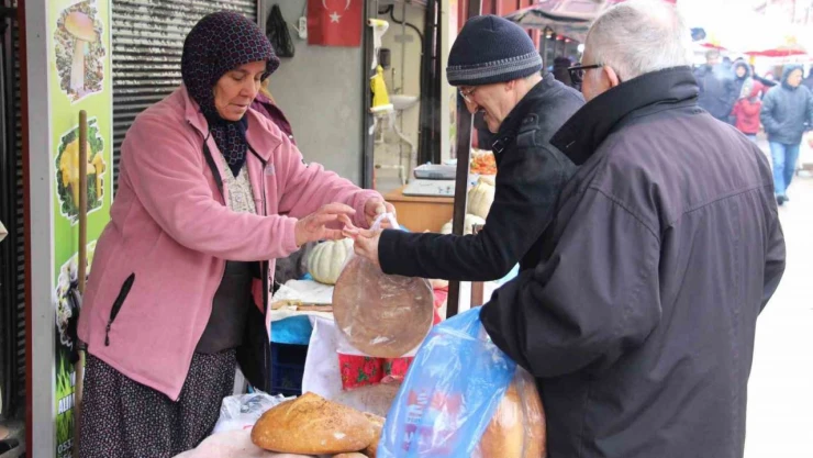 Bolu’da Tepecik Mahallesi’nde yaşayan 66 yaşındaki Nazile Uygur, yaşına rağmen çalışmaya devam ediyor. Uygur, kızı ile oğlunun evde odun ateşinde hazırladığı ekşi mayalı ve patatesli köy ekmeklerini halk pazarına getirerek satıyor. Soğuk hava şartlarına aldırış etmeyen Uygur, sattığı ekmeklerle evin geçimini sağlıyor. Çok sayıdaki vatandaş, köy ekmeği almak için tezgâh önünde sıraya giriyor. Köy ekmeğinin doğal ve sağlıklı olduğunu söyleyen Nazile Uygur, tanesi 50 liradan günde 300 adet köy ekmeği sattığını ifade etti.