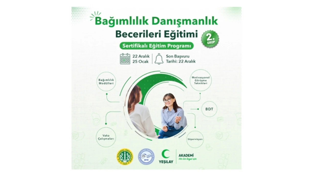 Yeşilay Akademi ile İstanbul Üniversitesi Sürekli Eğitim Uygulama ve Araştırma Merkezi (İstanbul-SEM) işbirliğinde düzenlenen Bağımlılık Danışmanlık Becerileri Eğitimi Sertifika Programı'nın 2. grubu için başvurular başladı.