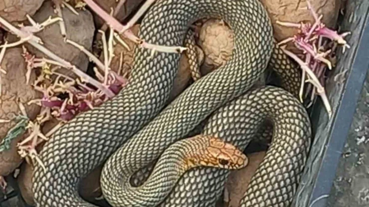 Bolu'da apartmanın önünde patates dolu plastik kasaya giren yılan, itfaiye ekiplerince bulunduğu yerden kurtarılarak doğaya bırakıldı.