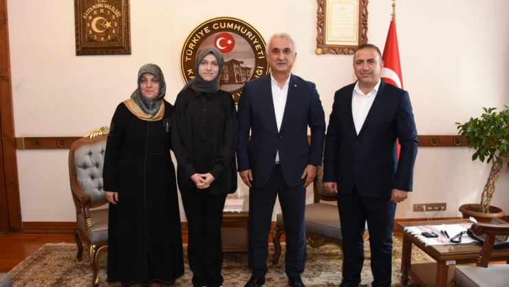 Yükseköğretim Kurumları Sınavı'nda (YKS) TYT ek puanlı yerleştirme de Türkiye birincisi olan Kastamonu Hüma Hatun Kız Anadolu İmam Hatip Lisesi Fen ve Sosyal Bilimler Proje Okulu öğrencilerinden Zeynep Sude Uzan, ailesi ile birlikte Vali Avni Çakır’ı ziyaret etti.