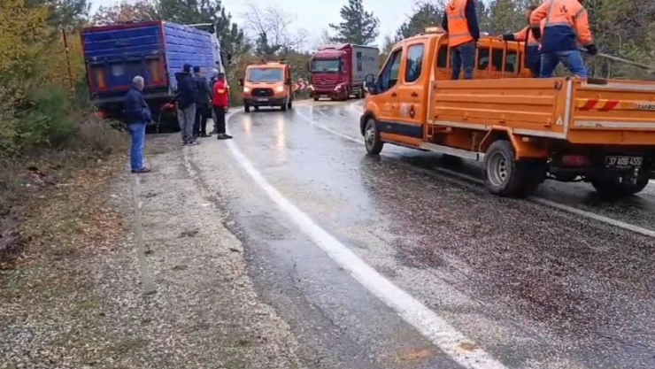Bartın’da balık taşıyan kamyonun kasasından dökülen yağ, trafiği felç etti.