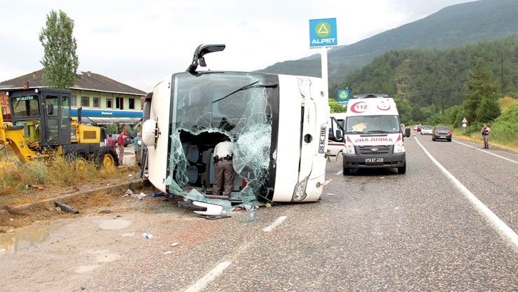 Antalya'dan Kastamonu'ya gelen yolcu otobüsünün devrildiği kazada, otobüs sürücüsü ve 35 yolcudan 27’si yaralandı. Toprakcuma mevkisinde yaşanan kaza sonrası büyük panik yaşandı. Devrilen otobüsün içindeki yolcuların yardımına çevreden geçen diğer sürücüler koştu. Edinilen bilgiye göre, 34 HC 1156 plakalı yolcu otobüsü sürücüsü Ahmet Altuntaş, Karabük-Kastamonu karayolu Toprakcuma mevkisinde seyir halindeyken, önüne çıkan taksinden kaçarken direksiyon hakimiyetini kaybetti. Altuntaş’ın tüm çabasına savrulan ve kontrol altına alınamayan otobüs devrildi. Devrilen otobüsün içinde bulunan 35 yolcudan 27’si çeşitli yerlerinden yaralandı. Kazada araç içerisinde sıkışan yolcuların yardımına birbirleri ve çevreden geçen diğer vatandaşlar koştu. Kaza sonrasında yaralı yolcular büyük panik yaşadı. Gelen ihbar üzerine olay yerine çok sayıda sağlık ekibi ve emniyet gücü sevk edildi. Yaralılara ilk müdahale olay yerinde yapıldı. Tedavi altına alınan yaralıların sağlık durumlarının iyi olduğu öğrenildi. Kazanın şokuyla yaşadıklarını anlatan sürücü Altuntaş; “Taksiden kaçıyordum. Yolun kenarında bulunan kanala düştüm. Savrulunca otobüs devrildi” dedi. İlk müdahaleleri olay yerinde yapılan yaralılar Araç, Kastamonu ve Karabük’teki hastanelere kaldırıldı. Jandarma ve polis ekipleri kazayla ilgili soruşturma başlattı. Ulaşım ise kontrollü olarak sağlandı.