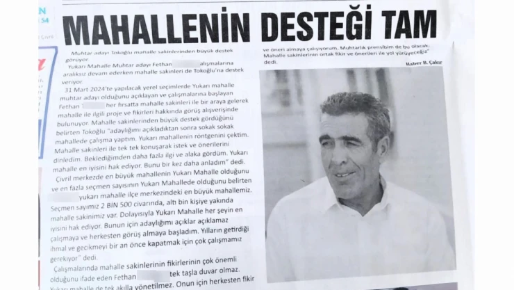 31 Mart 2024 tarihinde yapılacak olan Mahalli İdareler Genel Seçimleri öncesine Denizli’nin Çivril ilçesine bağlı merkez Yukarı Mahalle’de yaşayan Fethan T., muhtar adaylığını açıkladı. Çivril’de yayın yapan yerel gazetenin dünkü sayısında, muhtar adayı Fethan A. ile yapılan röportaj “Mahallelinin desteği tam” başlığıyla yer aldı.