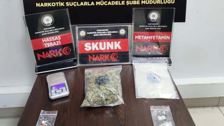 Kastamonu İl Emniyet Müdürlüğü ekiplerinin Kastamonu'da uyuşturucu madde kullanan ve satan şahısların yakalanmasına yönelik çalışmaları devam ediyor. Narkotik ekiplerinin çalışması sonucu tespiti yapılan iki şahsın yapılan üst ve araç aramasında 92,33 gram metamfetamin maddesi, 73,93 gram skunk maddesi, 1 adet hassas terazi ve uyuşturucu hap ele geçirildi. Yakalanan S.Y. ve C.K. isimli şahıslar tutuklanarak ceza infaz kurumuna teslim edildi.