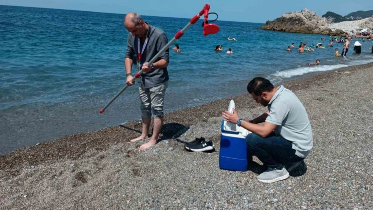 Zonguldak'ta halkın yoğun olarak kullandığı yüzme alanlarında deniz suyu numuneleri İl Sağlık Müdürlüğü Halk Sağlığı Hizmetleri Başkanlığına bağlı Çevre Sağlığı Biriminde görevli sağlık personelleri tarafından alınarak analiz ediliyor.