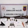 Zonguldak’ta düzenlenen operasyonda tarihi eser niteliği taşıyan objeler, dedektörler ve ruhsatsız silahlar ele geçirildi.
