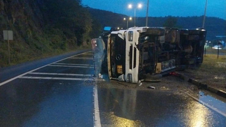 Uğur G. (33) idaresindeki 41 N 3700 plakalı tanker, dün akşam saatlerinde Alaplı ilçesinden Karadeniz Ereğli istikametine seyir halindeyken yolun kaygan olması sebebiyle direksiyon hakimiyetini kaybederek devrildi.